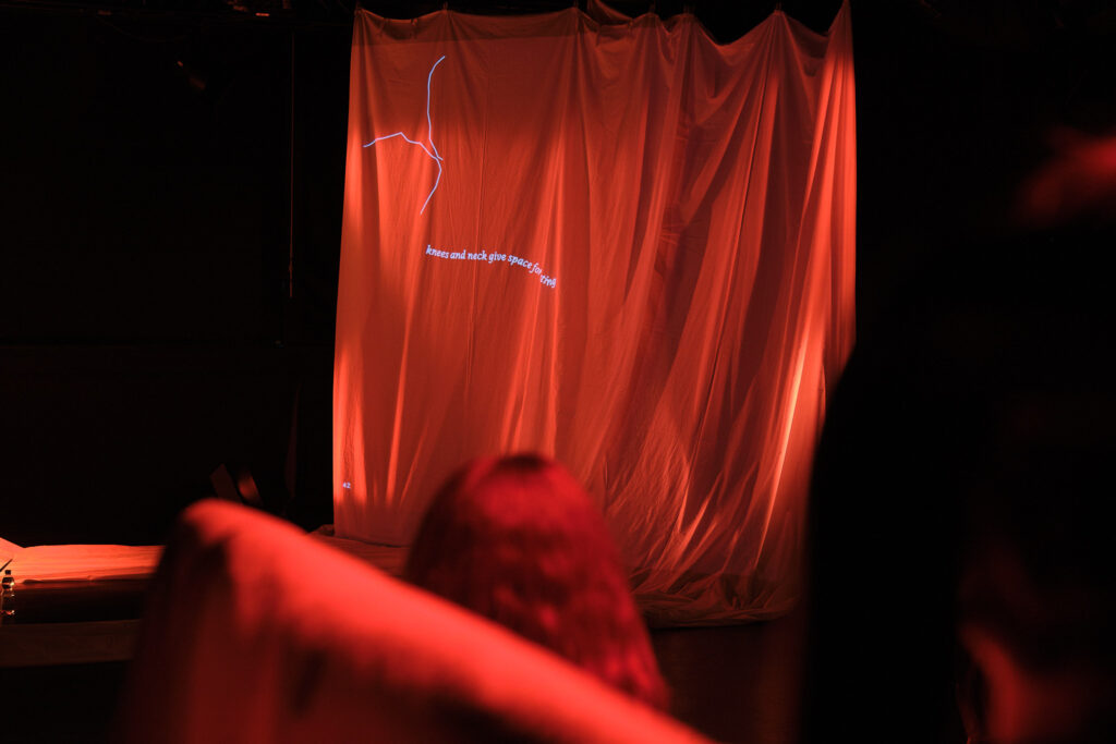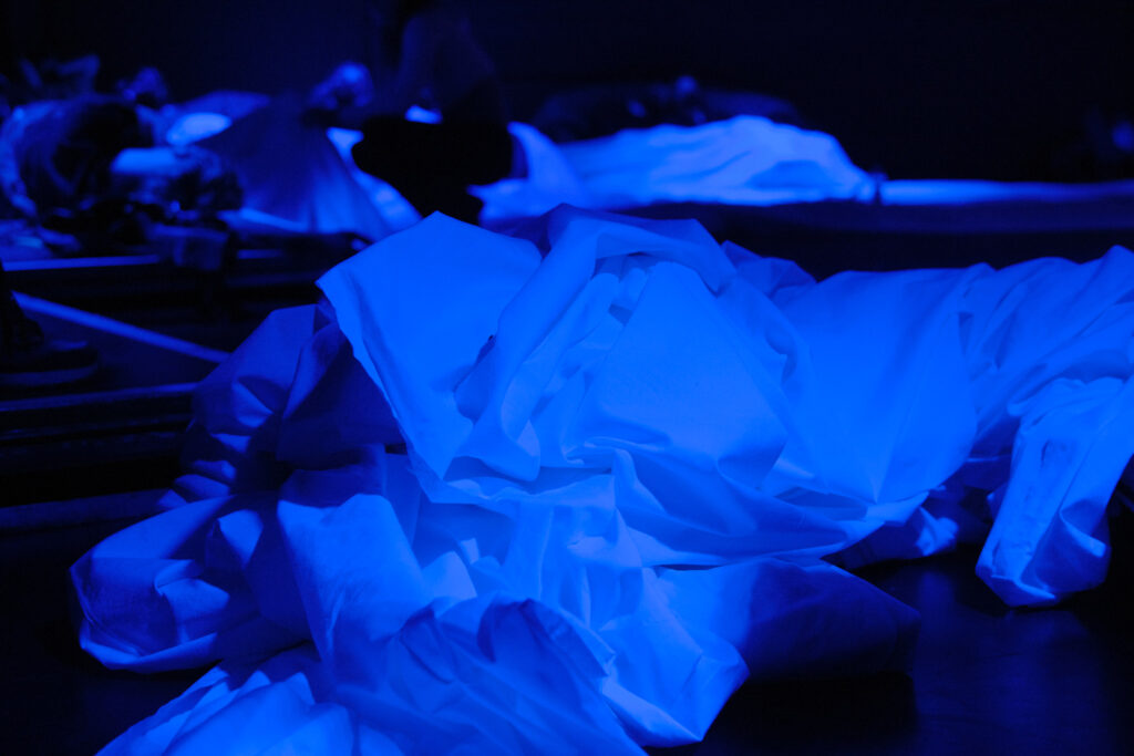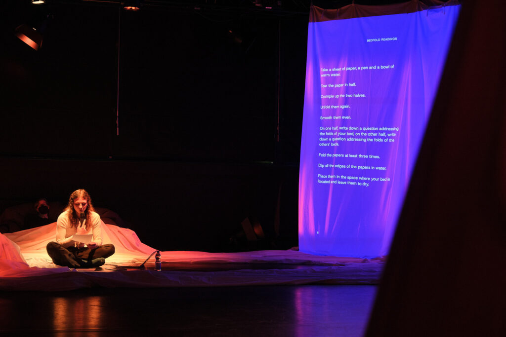 Ein Knick, eine Ebene, mehrere Layer, ein paar Linien, die sich treffen, kreuzen, auseinanderdriften. Falten in Kissen, Decken und Laken lassen sich nicht nur als Spuren von Körpern lesen, sondern weisen über die im Bett verbrachte Zeit hinaus in eine Zukunft ungekannter Bedürfnisse und Gemeinsamkeiten, die sich bereits gestern erfüllt haben können. Seit mehr als einem Jahr bietet Jeanne Eschert regelmäßig Bettfaltenlesungen an, bei denen sie Magie, Rituale, Handlesen, Choreografie und Erfahrungen im Bett miteinander verbindet und sich damit an Menschen richtet, die viel Zeit im Bett verbringen und eine besondere Beziehung dazu aufgebaut haben – Menschen mit chronischen oder psychischen Erkrankungen, Behinderungen oder deren Umfeld. Im Rahmen der Bettfaltenlesungen sind Texte und Fotos entstanden, die in einer performativen Lesung präsentiert werden und dazu einladen – wenn die Stimmung passt – auch vor Ort gemeinsam in den Falten zu lesen. Jeanne Eschert fragt, was wir in den Falten lesen oder wie wir uns darin verbergen können.