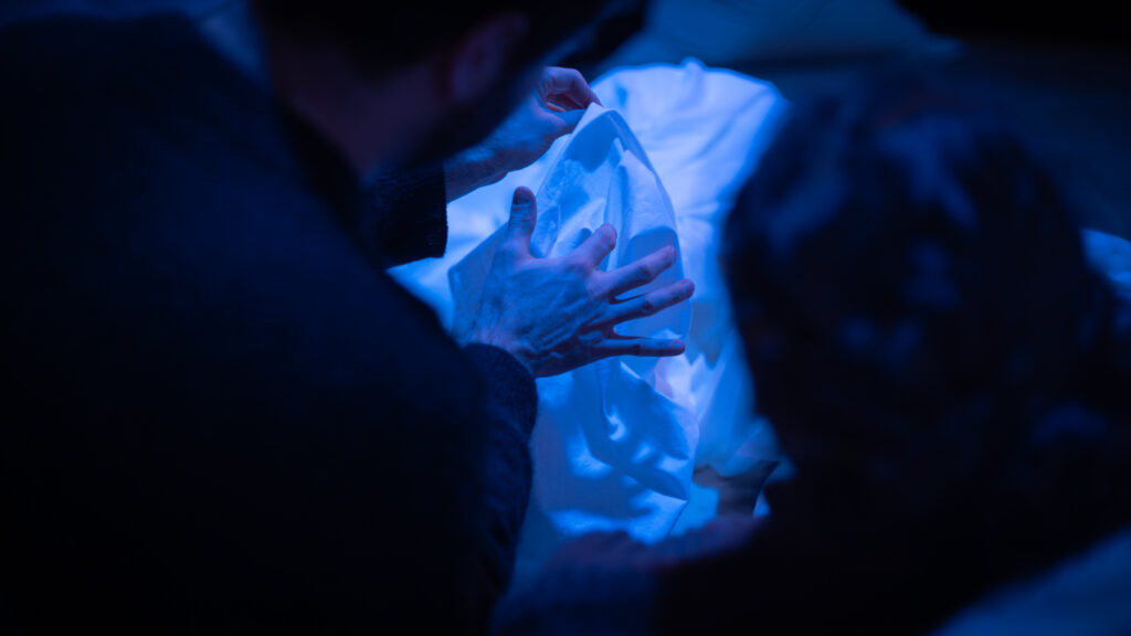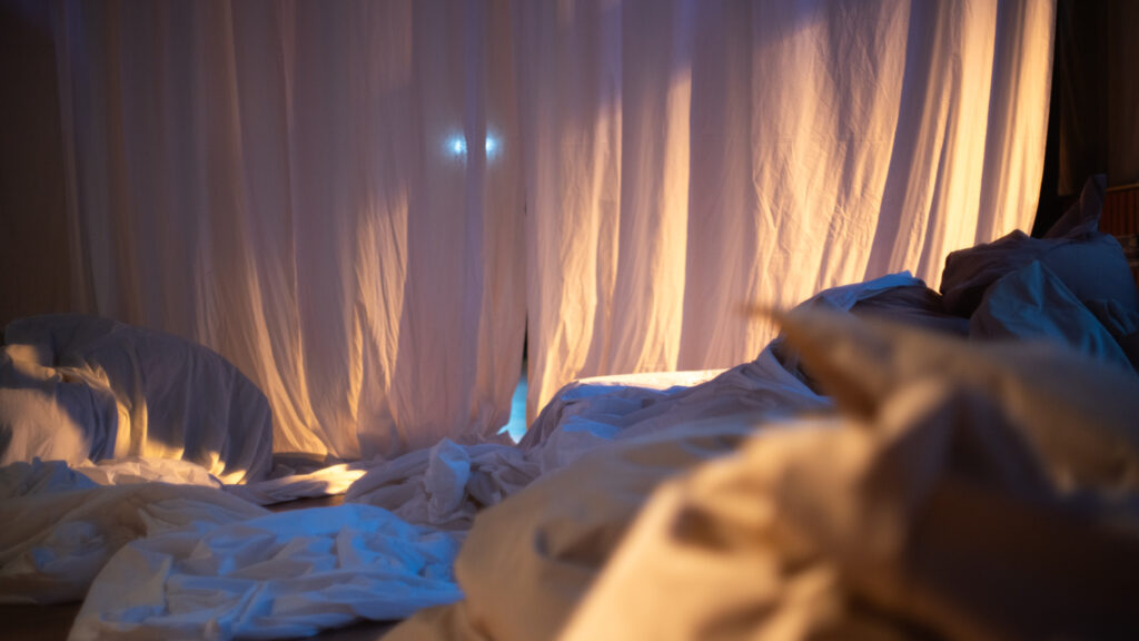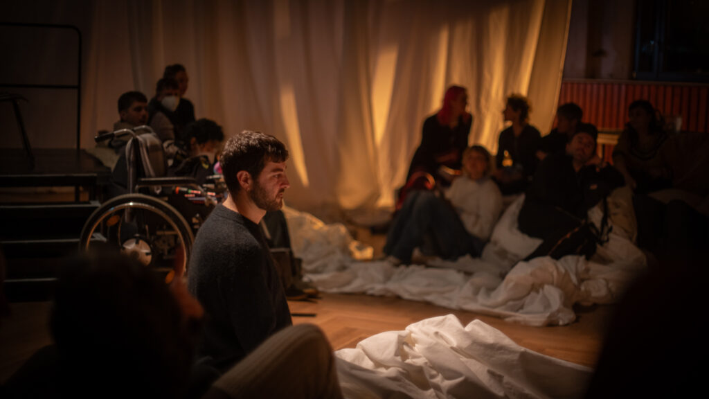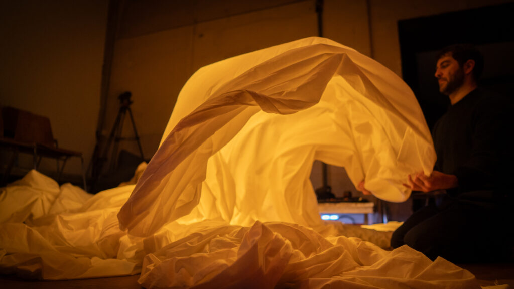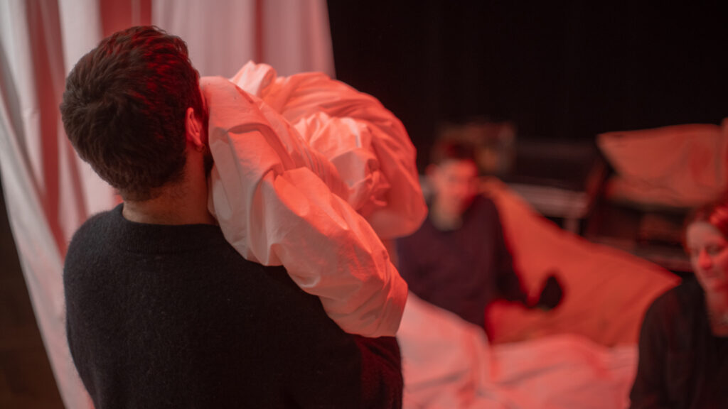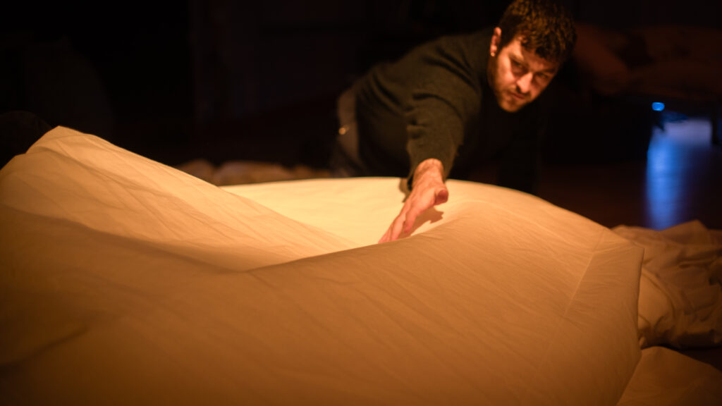 Eine Versammlung auf der Bühne, um eine Vorhersage zu wiederholen, die bereits gestern wahr geworden ist. Die Bettfalten werden zu uns sprechen und uns von Bedürfnissen erzählen, die wir wahrscheinlich noch nicht kennen. Verbindungen entstehen neben der Tatsache, dass wir nicht gehen, laufen oder sogar aufstehen müssen. Dass wir geschützt sind, ohne unsere Muskeln anzuspannen, ohne viele Menschen zu kennen, ohne Geld, Versicherung oder Reisepass.